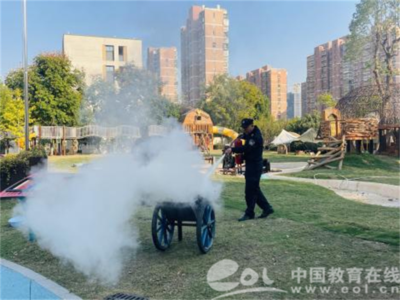 撤离到操场上以后,保安叔叔向全体教职工和幼儿演示了灭火器的正确使用方法。当火苗被扑灭的瞬间,小朋友们都激动地鼓掌。
