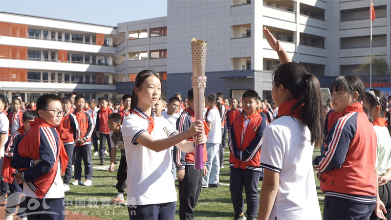 随后,火炬传递仪式在《我的深情为你守候》乐曲声中举行,谢毛三亲手把亚运火炬郑重交给儿子包忠瑞,20位优秀学生代表环绕田径场依次传递,最后一棒传到沈阳校长的手中。沈阳高举火炬站在主席台上,全场掌声雷动。来自良渚古城的文明之光仿佛在二校熊熊燃起,全体二小人“勇立潮头,蓬勃向上”的校训依稀在耳边再次响起。