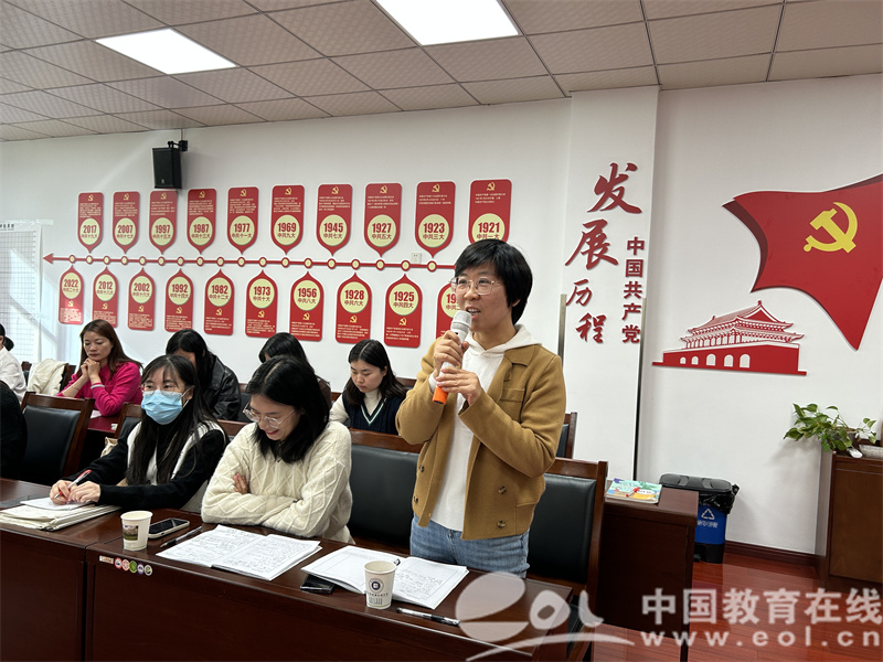 随后,宁波仁爱中学的教师代表进行了评课。他们充分肯定了吴老师的授课,认为她尊重了学生的主体地位,评价学生用语生动,语言支架丰富。教师代表们认为她也具备了单元整合理念,重视课文重点词汇复现率。代表们还指出吴老师教学目标设定清晰,课堂板书体现出目标语言,体现课堂语言的内部逻辑。但同时代表们也指出,吴老师的课堂仍需要加强整体教学理念,多设置高阶思维的教学活动。