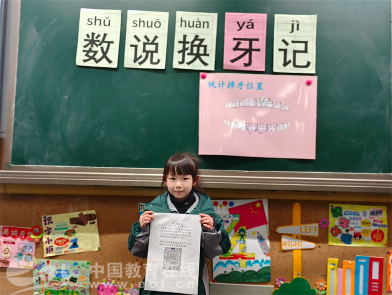 那么,人为什么要换牙呢?在换牙的时候要注意些什么呢?怎样保护牙齿不长蛀牙呢?针对这些问题,花园小学一年级的孩子开展了“数”说换牙记的项目式非纸笔测评。在老师的指导下,同学们了解了牙齿的基本知识,互相数一数乳牙掉落颗数记录下来,并在班级里用“正字”的方式进行统计不同牙齿的数量,用“数”来展示换牙齿的秘密。