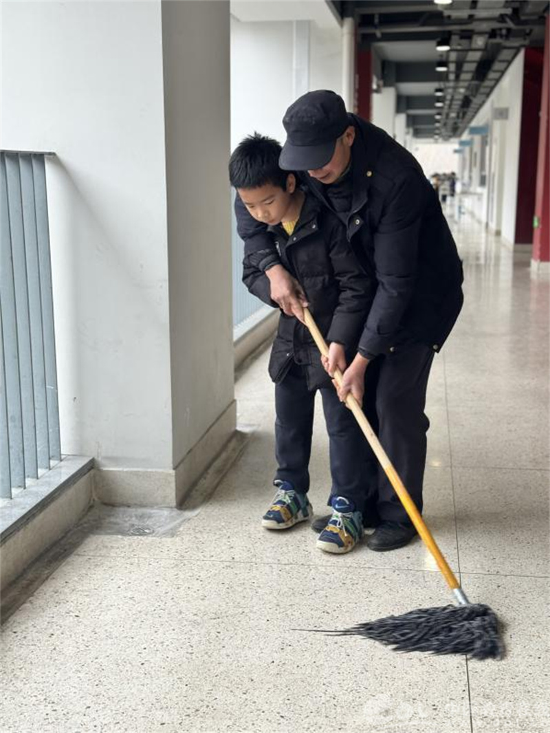 “你看,这个地上上的痕迹,要要这么擦才更省力、更干净。”保洁马师傅正在教学生如何拖地。“没想到自己也能成为孩子们的老师,我会好好‘备课’的。”保洁马师傅说,“特别是刚刚入学的一年级的孩子们,我想先教他们从认识几种常见的清洁工具,选择和使用合适的清洁工具,希望他们能又快又好的做好教室和家里的卫生工作。”