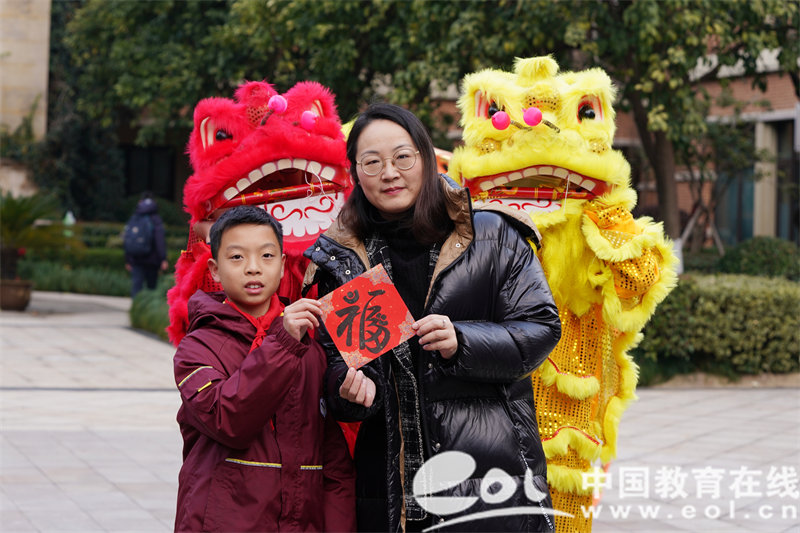 走进教室,板凳还没坐热呢,远处就传来了敲锣打鼓声。往窗外一看,原来是“祥龙送福”队来班级送祝福了。“一条长龙”“两头狮子”蹦蹦跳跳地就进来,两头小狮子热情地和班级里的同学们握手、拥抱,希望把龙年的福气带给每一个同学。紧跟着还进来一行人,有人送“福”字,有人送心愿签,十分热闹。