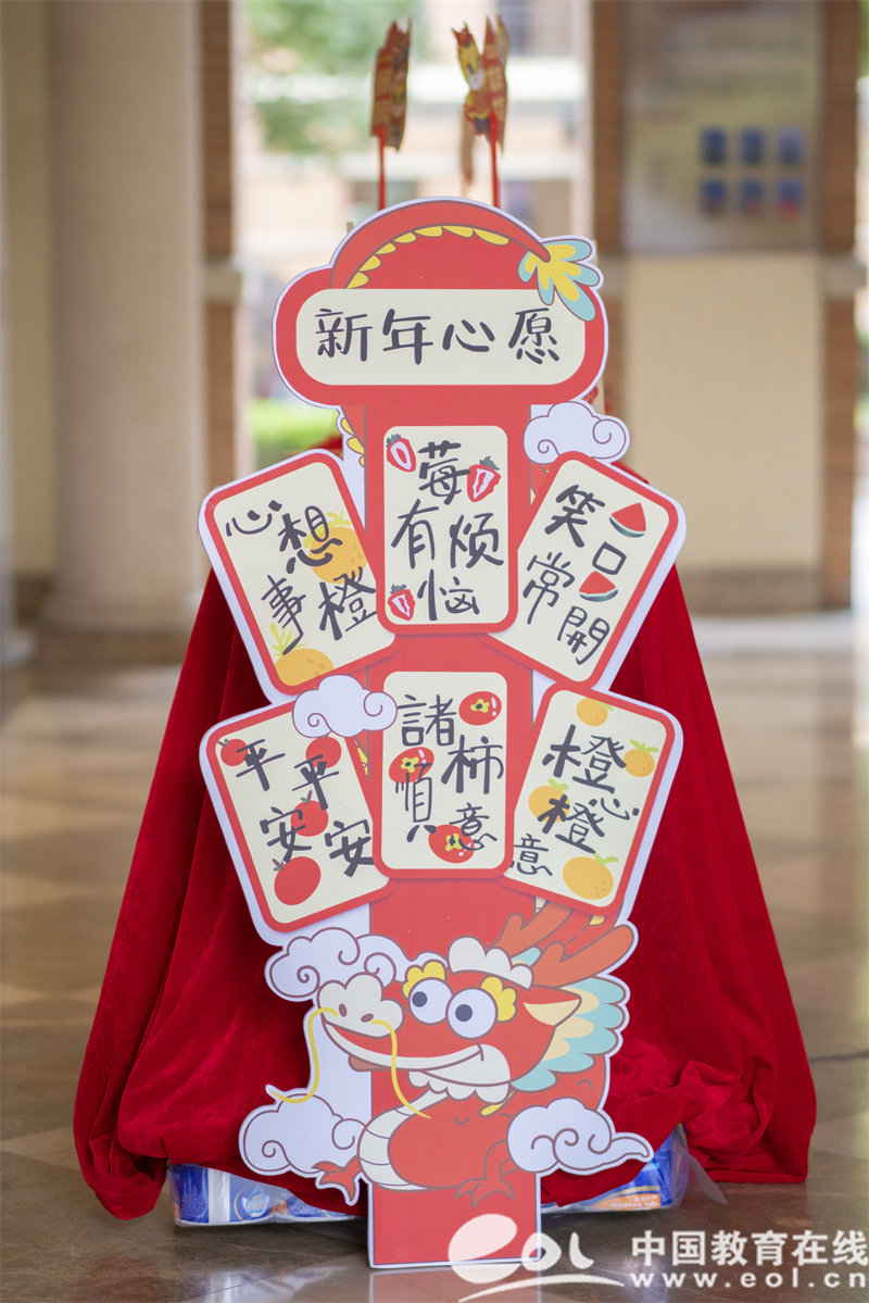 往里走到大厅,就会看到这样一幅景象。原来这些创意“福”都是同学们的现场创作。让人不禁感叹“同学们真是才华横溢呀!”大厅里不仅有创意“福”,还有同学们亲手制作的龙年花灯、新年心愿签。整个大厅红红火火,新学期氛围拉满。