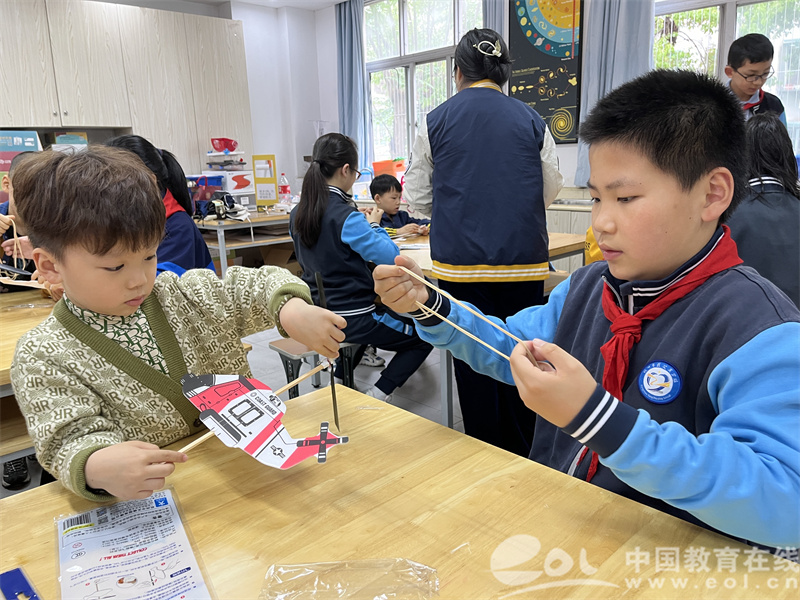 六年级的同学手把手教小朋友们一步步制作橡皮筋飞机。一架小小的飞机承载着大小朋友的科技梦想一同飞向天空。据了解,每年蒋筑英学校的学生都有很多机会参加各级各类的科技比赛项目,获得的奖项更是数不胜数。
