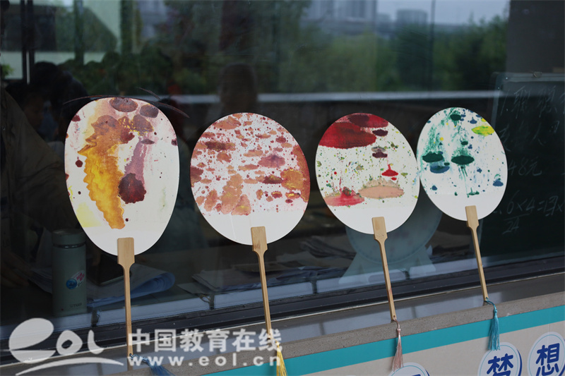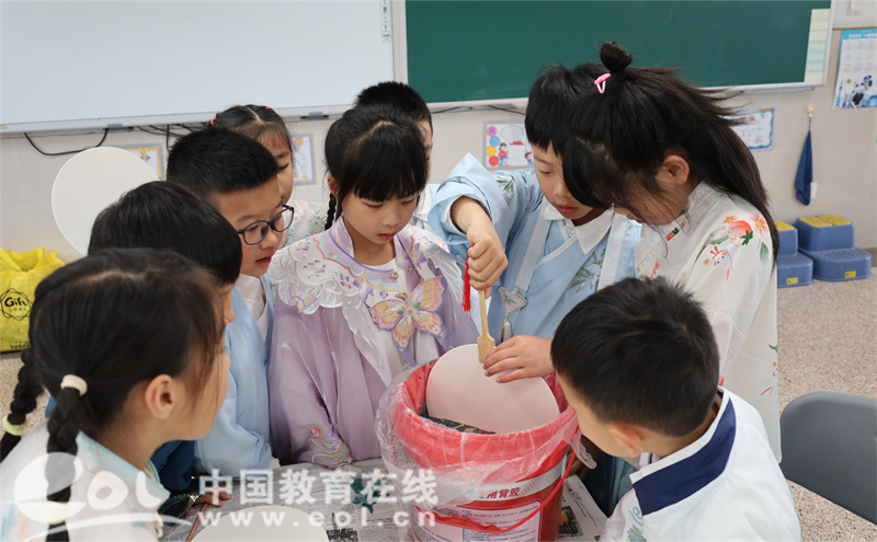 二年级的孩子们在班级里聚精会神地听教师讲解漂漆扇的制作过程,跃跃欲试等待参与制作。漆扇是基于非遗大漆工艺开发的一种现代创新工艺,以漆为媒,以扇为纸,因为色漆在水面上会形成流动的花纹,扇面与水面的交融形式随机变化,也让漆扇被称为“无法预计”的艺术品。