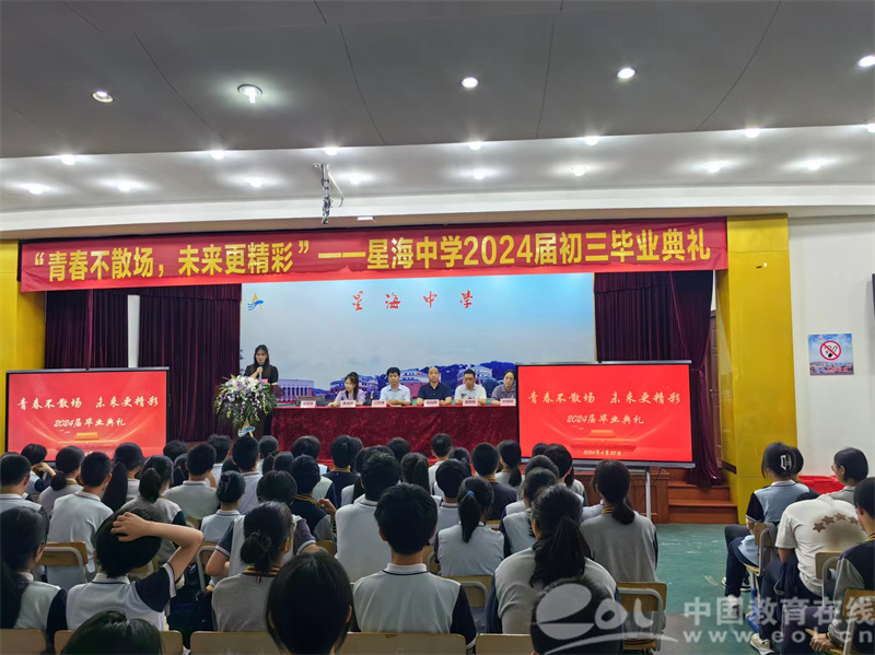 金宝搏188入口 浙江站讯 (通讯员 孙卢寅)6月25日下午,宁海县星海中学在报告厅举行了2024届初三学子毕业典礼。此次大会由政教处郑慧侠老师主持,校长江式慷、副书记童远腾及相关行政领导、全体初三师生出席参加。