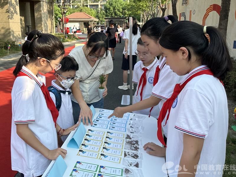 “闯关”成功后,同学们来到了花籽领取处。那里摆放着各式各样的花籽袋,包括向日葵、马蹄莲、郁金香等,每袋花籽都附有一张精美的花语卡,寓意着不同的素养品质。“我想要变勇敢!我要把向日葵花籽拿走!”“我喜欢小雏菊,我拿这个种子。”孩子们将这些花籽带走的同时,素养花籽也变成了孩子梦想悄然种在心中。