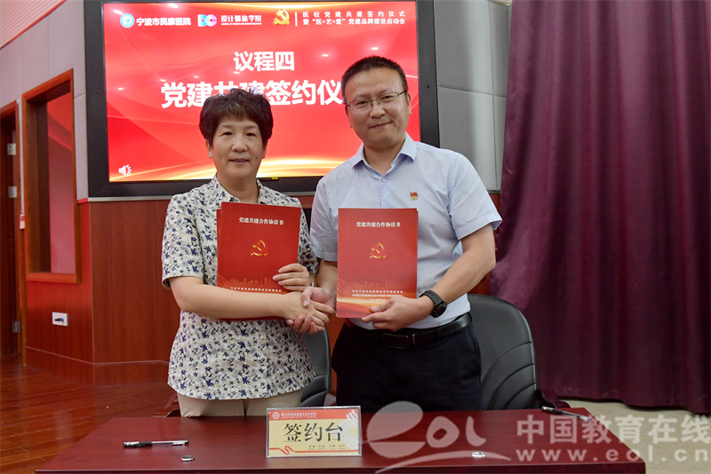 活动中,宁波市民康医院院长兼党总支书记陈亚萍和设计媒体学院党委书记姚雪存共同签署了《党建共建合作协议书》,双方将以党建工作为引领,整合资源优势,推动艺术与医学深度融合,加强人才培养与项目合作,通过专业实践赋能、公益志愿服务等形式,充分发挥医校党建共建的育人价值和社会价值,助力“医+艺=爱”党建品牌项目提质培优。