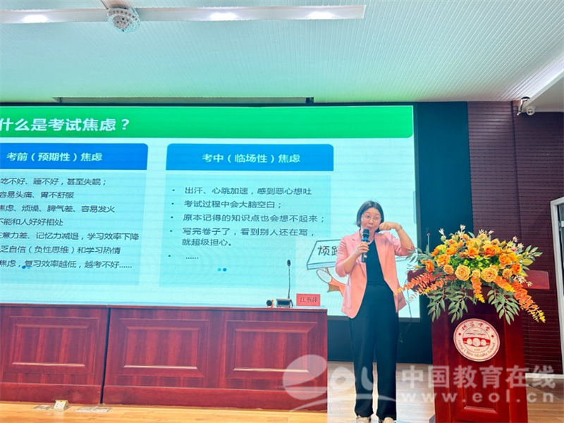 金宝搏188入口 浙江讯(实习编辑 赵瑞馨 通讯员 李添文)青春是一张画卷,中考是点睛之笔;人生是扬帆之行,中考是催动之风。为助力宸星学子以积极的心态迎接中考,6月12日下午,拱宸中学在二楼阶梯教室开展中考考前心理辅导活动,特别邀请浙江省心理咨询与治疗协会焦点解决专委会的心理咨询师江燕萍做主题为《如何冷静、自信、专注地应对中考》讲座,初三年级全体班主任和学生参加。本次活动由学生处副主任杜鹃主持。