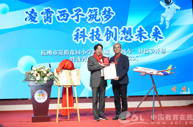 这一幕,发生在笕桥花园小学“大风车”科技节开幕式暨凌霄西子科技馆开馆仪式上,著名企业家、全国劳动模范、西子联合控股集团(以下简称“西子集团”)董事长王水福为凌霄西子科技馆揭牌,并向学校捐赠了C919飞机模型和9F级燃气轮机余热锅炉。