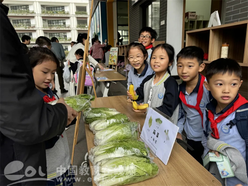 活动现场,同学们积极参与,各司其职,有的负责热情吆喝,吸引顾客;有的耐心介绍商品,传递着学校屋顶农场的绿色理念;还有的负责收钱找钱,将所学的数学知识灵活运用到实践中。