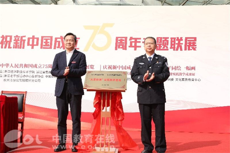 浙江自然博物院副院长、研究馆员杨岭和学校党委副书记、校长柯孔林,为学校大思政课“弘道”展览集揭牌,并为“弘道”展览集师生宣讲员颁发聘书。