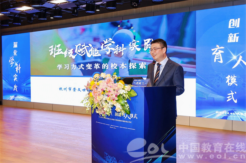 萧山区区长姜永柱现场致辞,他提到,2024年初,崇文世纪城实验学校以“管理一体化,师资互通,资源共享的方式”领办了亚运村实验小学,深化实施“新班级教育”,打造尚学萧山品牌。亚运村小学开学短短2个月,就受到学生、家长、社会的好评,为办好老百姓“家门口”的好学校,为萧山教育高质量发展做出了应有贡献。