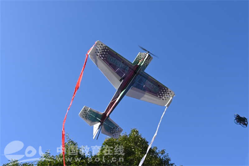 一架架轻巧的滑翔机在操场上空自由翱翔,它们或盘旋上升,或优雅滑翔,精准的操控和流畅的动作赢得了在场师生的阵阵掌声。