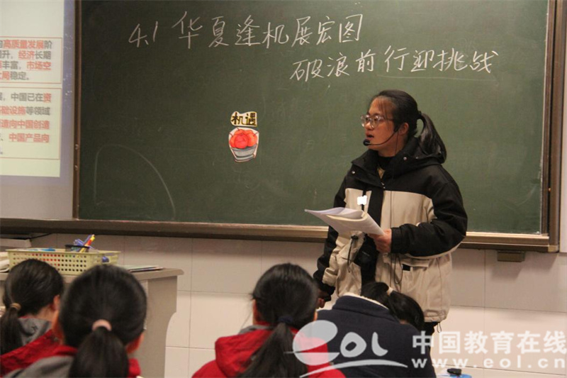 侯新新老师的课以第七届进博会的相关视频为导入引出本课课题《中国的机遇与挑战》。整堂课分别从新机遇、新挑战、新应变三个方面展开,立足于真实情境,引导学生了解我国面临的机遇和挑战,探究我国应对机遇与挑战的措施,知道我国应该如何与世界携手促进我国高质量的发展,充分激发了学生的爱国热忱。
