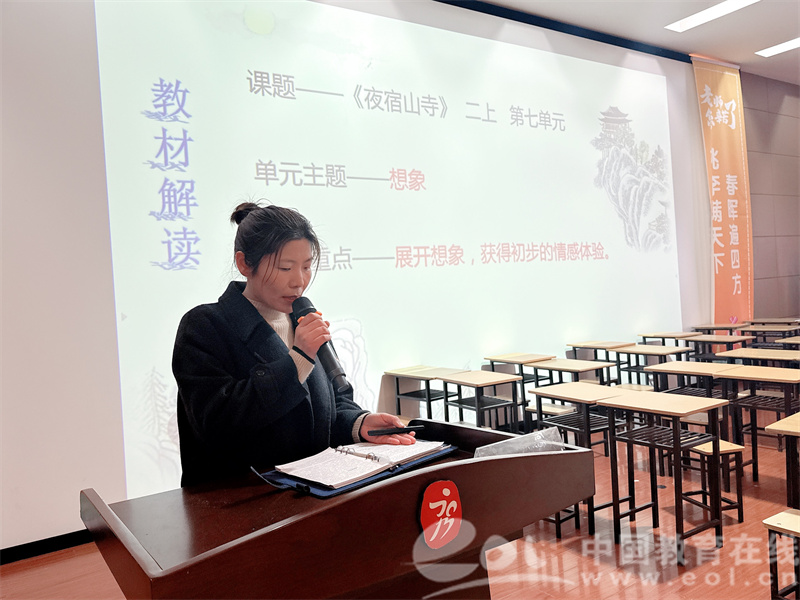 随后,语文教研组组长冯水仙老师为大家带来了《聚焦想象,探古诗之妙》的教材解读和教学策略分享。她指出,《夜宿山寺》这首诗是统编版二年级语文上册中的重要篇目,通过想象教学,可以引导学生获得初步的情感体验,感受语言的优美。冯老师的分享既有理论深度,又紧密联系实际,为教师们的古诗教学提供了新的思路。
