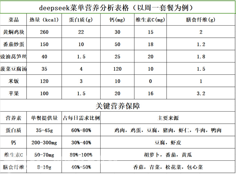 采访中,汪建生向记者展示了借助Deepseek的系统操作界面。该系统结合学生体检数据、季节变化、食材价格等多重因素,自动生成一周食谱,并详细标注了每道菜品的营养成分和热量。