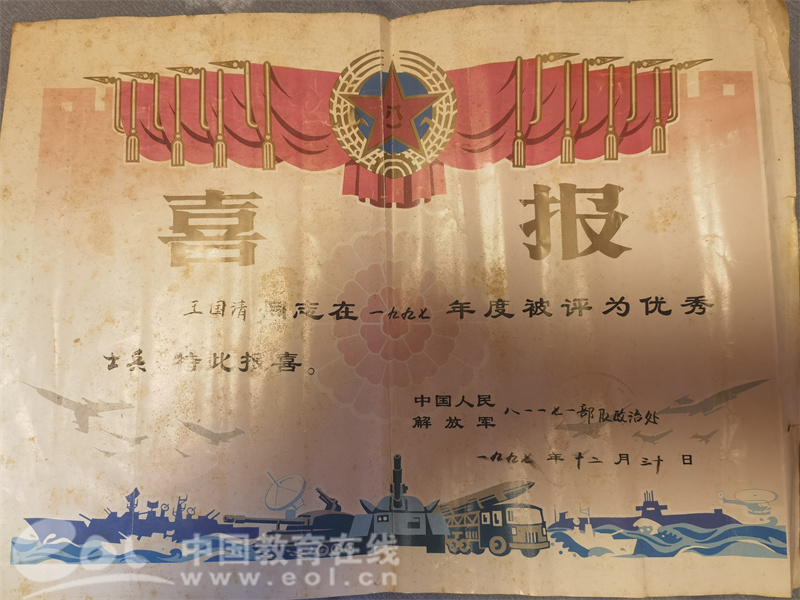 翻开王家的家庭相册,一张张泛黄的军装照串联起共和国的历史记忆:曾祖父1949年入伍;二爷王广1981年入伍,在内蒙古扎鲁特旗当炮兵;五爷王坤1986年入伍沈阳陆军;父亲王国清1996年入伍,于1997年获得“优秀士兵”的光荣称号,并于1998年7月1日光荣加入中国共产党。