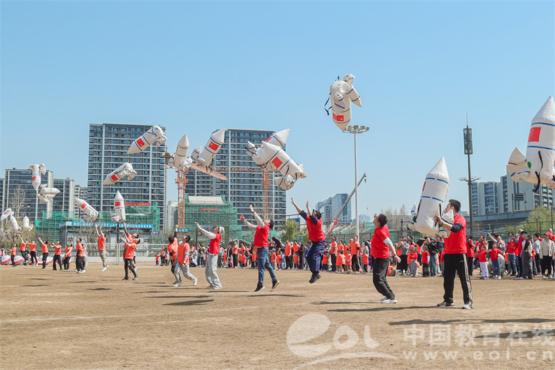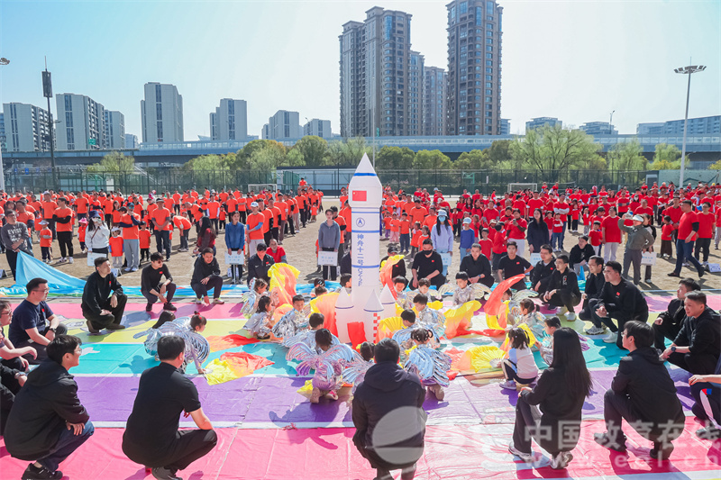 在激昂的《运动员进行曲》中,国旗方阵率先入场。多组“宇宙超人”家庭化身星际使者,通过机械舞展现太空漫步的独特韵律。家长代表在发言中表示,“当孩子们触摸星辰时,我们也在传递着航天人特别能吃苦、特别能战斗的精神基因。”幼儿代表则用稚嫩的童声许下承诺,“要像航天员叔叔一样勇敢探索,长大后建设更强大的祖国。”