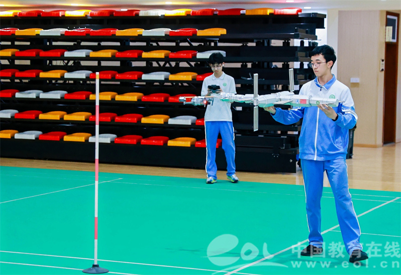 比赛难免会发生不可预测的情况,114班参赛小组就在赛前遇到了意外——两架运输无人机中,有一架在赛前“罢工了”。陈梓杰作为制作模型的主力,立刻决定调整策略——由一台无人机和一个组员共同运输,并和队友快速开始重新调试设备。