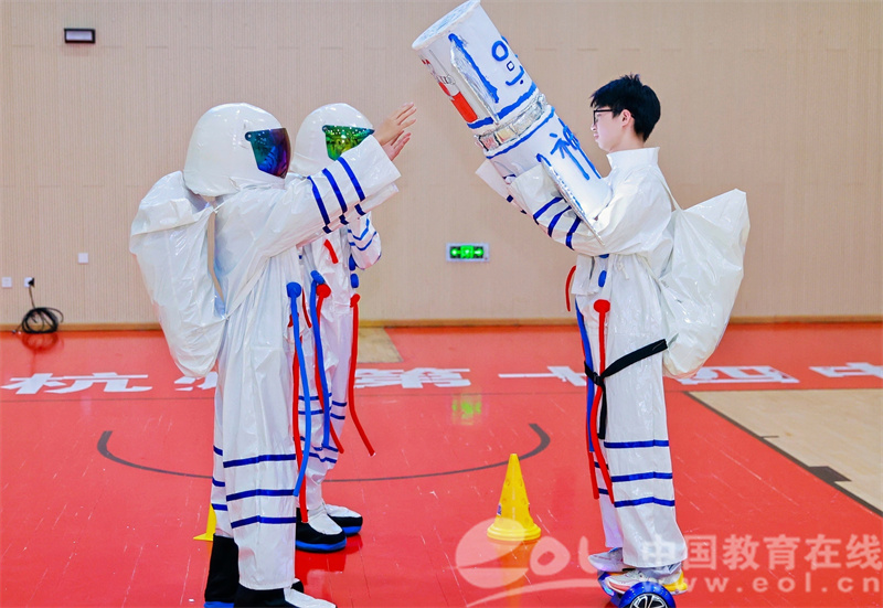 赛前半小时,选手们都在紧锣密鼓地进行最后的调试。109班参赛小组的陈宇轩穿好“宇航服”踩上了平衡车,演练过程中,却不小心跌了下来。在大家担忧的目光中,他迅速起身调整状态,不到几分钟时间,他已和三位队友商量好了改进的对策。