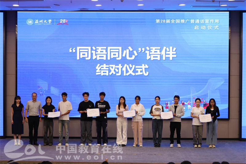 启动仪式上举行了“同语同心”语伴结对活动,10位少数民族和汉族同学结成对子,共同学习、提高普通话水平。温州市教育局基教处处长吴永远为这10位同学颁发证书,勉励同学们学好普通话,加强交流沟通、凝聚民族情谊。学生代表余佳豪同学宣读了推广普通话倡议书,号召全校师生积极推广国家通用语言文字,以实际行动促进校园文明建设。