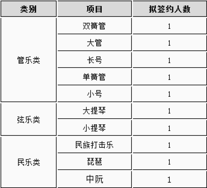 2023年高水平艺术团招生计划为5人,拟签约人数为10人,基于艺术团建设需求制定各项目的拟签约人数,最终将根据测试结果,本着“择优录取、宁缺毋滥”的原则确定各项目实际签约人数。具体如下: