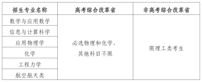 为全面贯彻全国教育大会精神,深入落实《国务院关于深化考试招生制度改革的实施意见》(国发〔2014〕35号),根据《关于在部分高校开展基础学科招生改革试点工作的意见》(教学〔2020〕1号)等文件,服务国家重大战略需求,加强基础学科拔尖创新人才选拔培养,经批准,我校自2020年起开展基础学科招生改革试点工作(也称“强基计划”),探索多维度考核评价模式,选拔一批有志向、有兴趣、有天赋的青年学生,培养具有空天报国情怀、扎实数理基础、科学创新能力、全球视野格局的高素质拔尖创新人才,为国家重大战略领域输送后备人才。