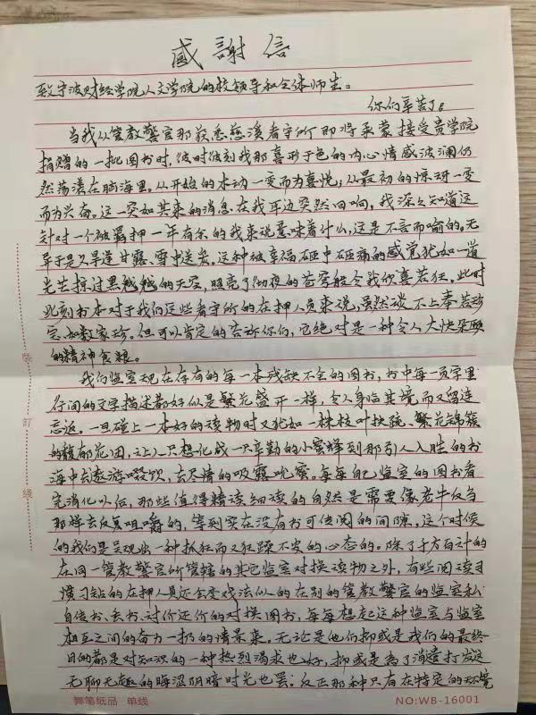近日,宁波财经学院人文学院党委书记谢小风收到了一封从慈溪市看守所寄来的感谢信,字里行间包含感激之情。写信人是在押人员高某,信中他表达了对宁波财经学院捐赠图书给慈溪看守所的感激之情。