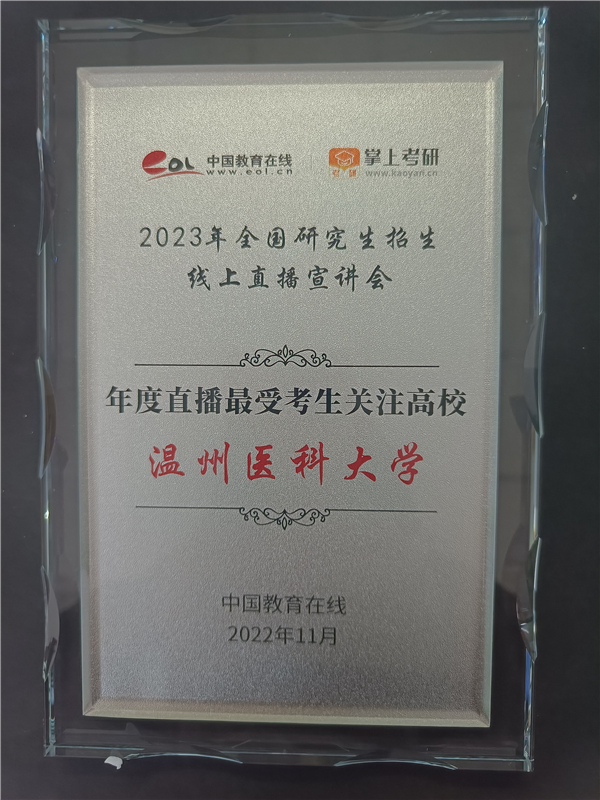 近日,金宝搏188入口 “榜样力量·2022年度研究生教育评选盛典”评选获奖名单揭晓,温州医科大学荣获“2022年度直播最受考生关注高校“荣誉称号。