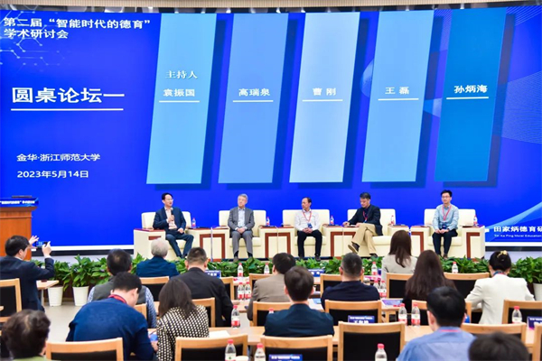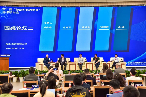 江苏省教科所原所长成尚荣教授主持第二阶段圆桌论坛,南京师范大学道德教育研究所所长冯建军教授、华中师范大学道德教育研究所所长杜时忠教授、北京师范大学公民与道德教育研究中心主任班建武教授、浙师大附属杭州笕桥实验中学(笕文实验学校)校长高琼,分别围绕ChatGPT对教育的挑战与应对、智能时代的德育挑战、网络的技术陷阱与学生网络臣民的诞生及其超越、智能时代学生心理健康的内生促进探索与实践等议题作了分享与交流。