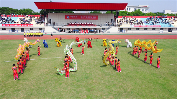 开幕式上,宁波财经学院的学生们带来了精彩的表演,分为“薪火相传”、“心手相连”、“欣欣向荣”三个篇章。宁财院健美操俱乐部、“星空”舞蹈团带来大型表演《龙舟竞渡》,展现了宁波的悠久灿烂历史。该校龙狮队、武术队、“欢沁”民乐团激情演绎《龙狮献瑞》《剑舞盛世》《盛世国乐》节目,气势宏大、表演精彩、震撼人心,赢得了全场观众的热烈掌声。跳跃的音符演奏着阳光活力,动感的舞姿衬托着青春风采,伴随着《一起向未来》《勇敢去飞》的美妙旋律,宁财院健美操俱乐部带来了大型啦啦操表演。舞蹈《等你来》由该校亚运会预录用志愿者代表集体表演,集中展现了宁财青年自信专注的面貌与活力。歌舞《跨越》舞姿优美、歌声嘹亮,翩跹的长裙和飞舞的衣袖,传递了宁财师生对本次大学生运动会的美好祝福。在大家的欢呼声中,亚运会吉祥物“琮琮”“莲莲”“宸宸”,大运会吉祥物“宁宝”“甬美”,同全体表演同学、志愿者们齐聚运动场中央,一起为杭州亚运会、宁波市大运会欢呼喝彩、加油助威,展现了大学生们充满青春活力的勃勃生机,传递着“用心交融,互相包容”的杭州亚运会精神,更是对“更高、更快、更强、更团结”的奥运精神的生动诠释。