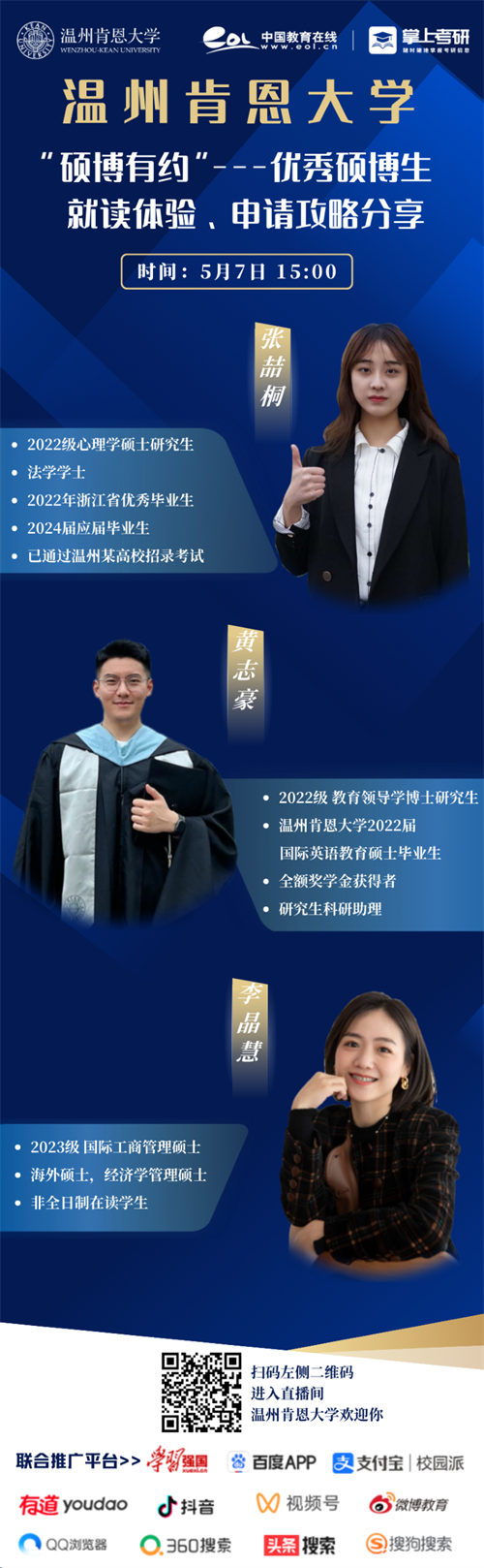 直播预告 | 5月7日15:00,温州肯恩大学2024年“硕博有约”---优秀硕博生就读体验、申请攻略分享来了!