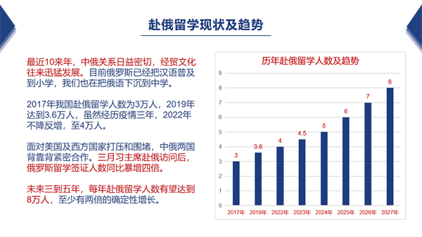 近年来中俄关系日益密切,经贸文化往来迅猛发展。面对西方国家的重重压力,中俄两国背靠背合作。去年三月赴俄国事访问后,俄罗斯留学签证人数同比暴增四倍。未来三到五年,每年赴俄留学人数有望达到8-10万人。