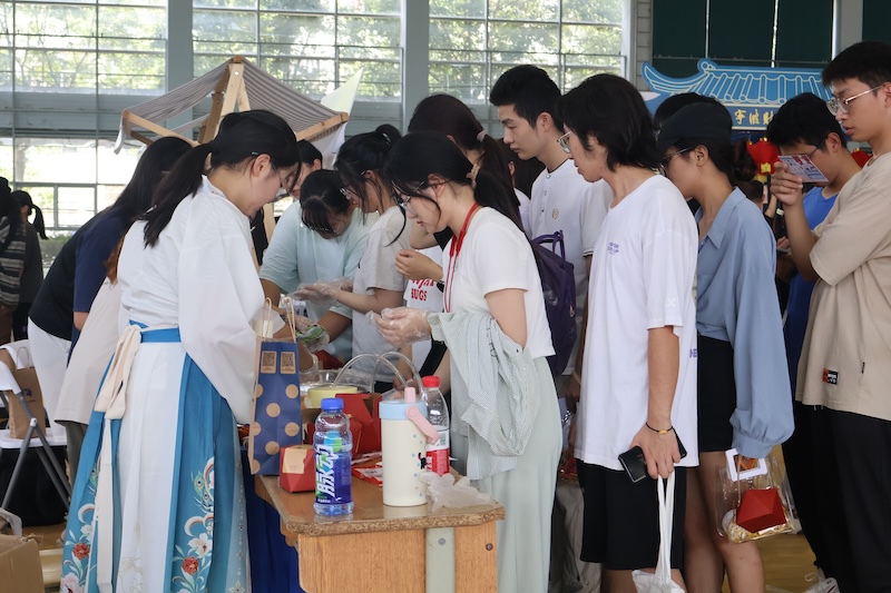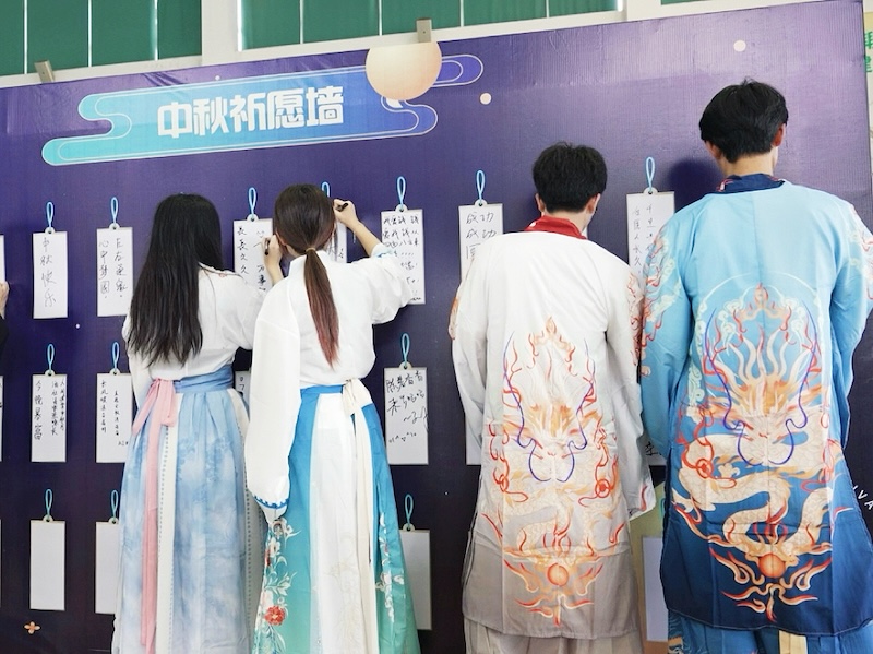 “举头望明月打一中药名是什么?”猜灯谜、飞花令等游戏摊位前也人声鼎沸,同学们穿梭其间,以诗词会友,不时传来猜中谜底的欢呼。不少同学还穿上了汉服,COS起了古人过中秋。