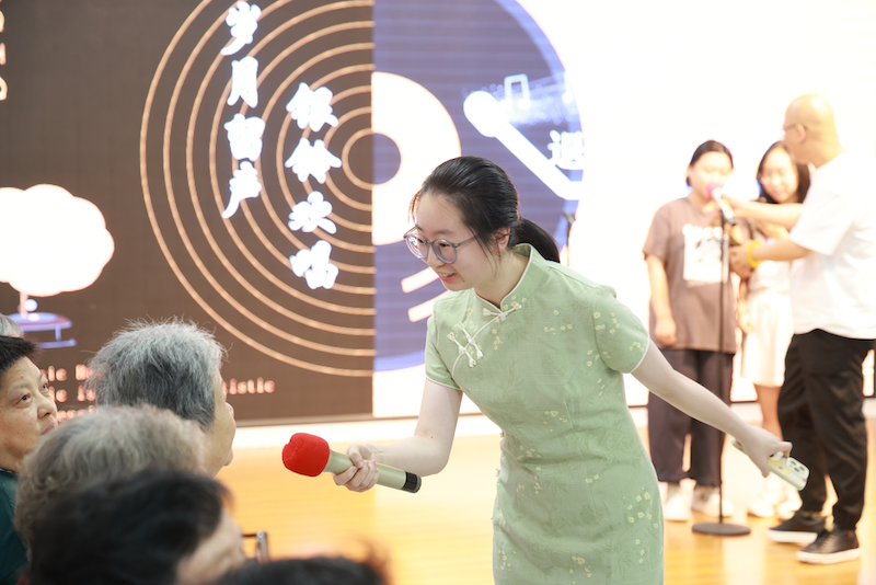 “洪湖水呀浪呀么浪打浪……”乐学堂美好生活教室里,学子们和老人们围坐在一起,共同唱响《洪湖水浪打浪》《小草》等经典歌曲,悠扬的歌声回荡在房间里。多功能厅内,听歌猜名活动热闹非凡,当《歌唱祖国》的旋律响起,老人们纷纷举手抢答,脸上洋溢着孩童般的笑容。