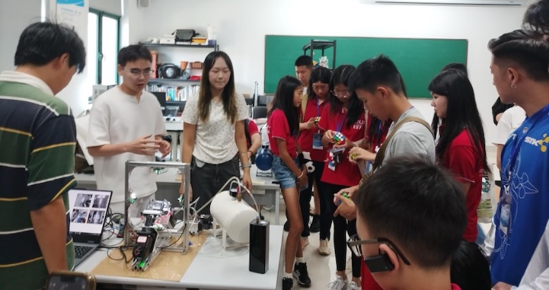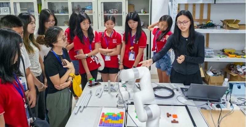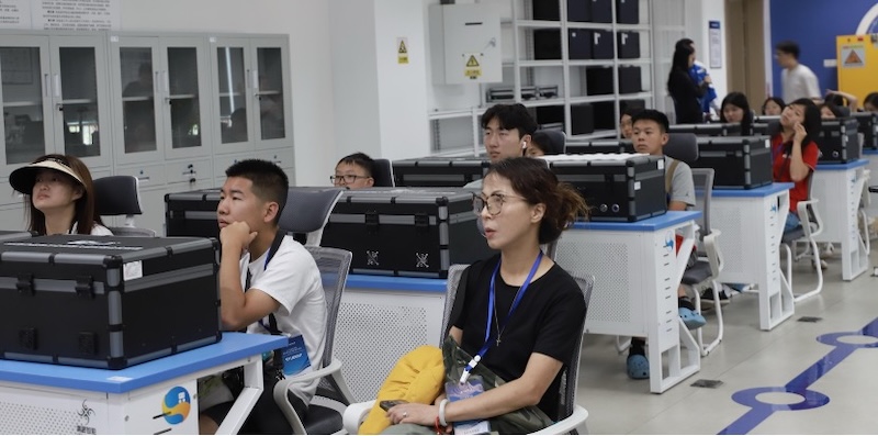 参观行程的亮点聚焦在格物楼的智能机器人创意实验室和智慧物流实验室。在智能机器人创意实验室,学生代表为交流团展示了机器人快速还原魔方、精准拼接俄罗斯方块以及对抗演示,精彩的演示引得美国学生赞叹不已。交流团学生们还亲自输入指令操控机器人完成动作,干净利落的动作赢得了现场阵阵掌声。智慧物流实验室同样给交流团学生们留下深刻印象,在观看完演示片后,美国学生们近距离观察了机器人在物流打包、分拣、运输等环节的智能化运作,对现代物流技术的创新发展深感钦佩。