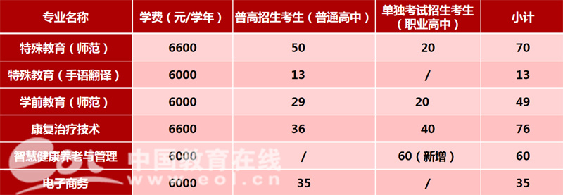 作为全省唯一、全国知名的特殊教育高等职业院校,学校遵循“残健融合、协同共培”的育人理念,在全国特殊教育高校中,学校在专业水平、师资力量、无障碍环境、就业质量等方面,部分指标达到甚至超过设有特殊教育专业的本科院校,总体水平走在全国前列。学校围绕“两个服务”的办学宗旨,已初步构建了以培养残疾人高技能人才为主,培养服务残疾人事业专门人才为辅的残健融合、协调发展的专业结构体系。对于普通高考招生,学校围绕服务残疾人事业专门人才推进以特殊教育专业为核心,康复治疗技术、手语翻译等专业为支撑,以学前教育为延伸,服务残疾人事业的特殊教育专业群建设。