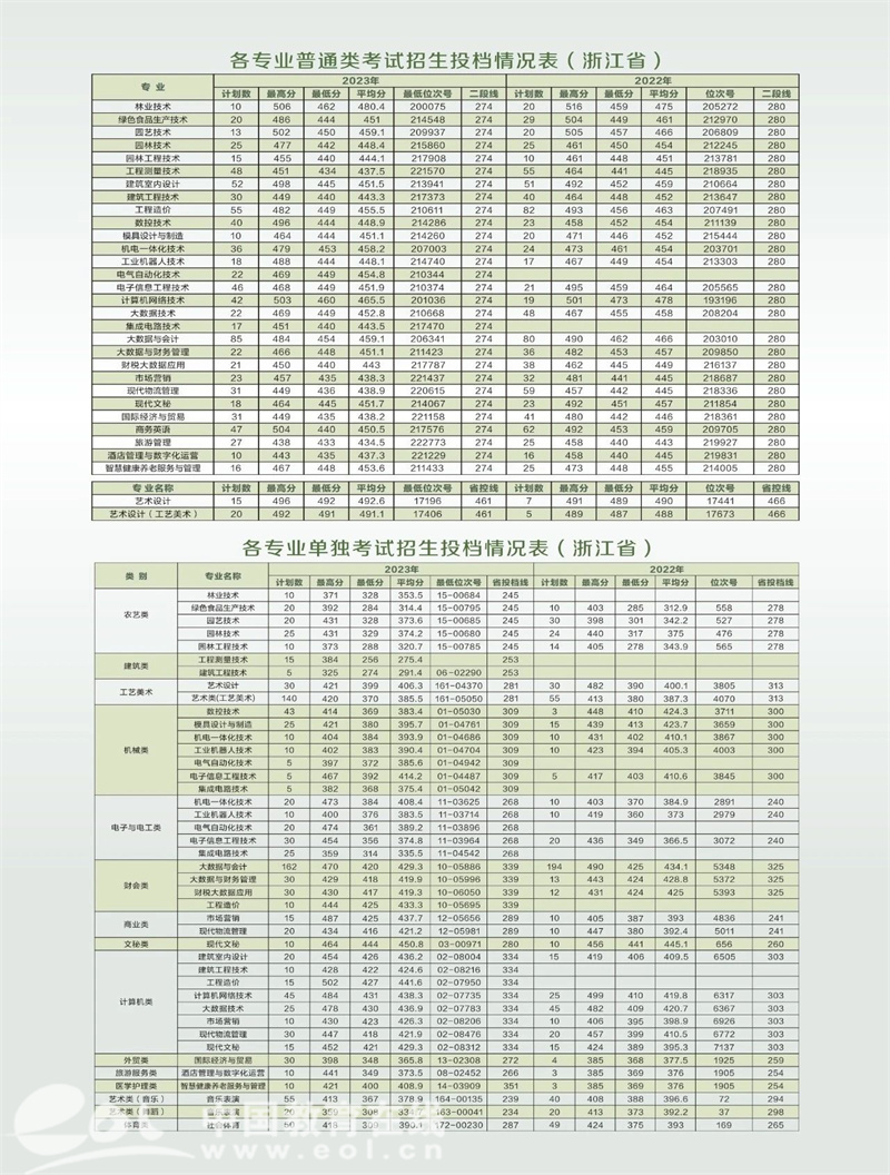 学校2022-2023年的各类录取情况可详见学校招生网“历年录取”栏目。2023年,丽职院和浙江农林大学合作的林学(林业技术)本科定向计划73名,录取分数640分以上8人,600分以上69人。2023年学校高职普高最高录取分为506分,最低录取分433分,最低位次号为222773名,整体分数集中在450分左右,位次号集中在20-21万。这二年,录取分数较高的专业:林业技术、大数据与会计、机电一体化技术、计算机网络技术、电子信息工程技术、工程造价、建筑室内设计、现代文秘、智慧健康养老服务与管理等。此外,就业特别好的工程测量技术、园林工程技术、旅游管理、市场营销、数控技术、机电一体化技术等专业都非常推荐考生们报考。